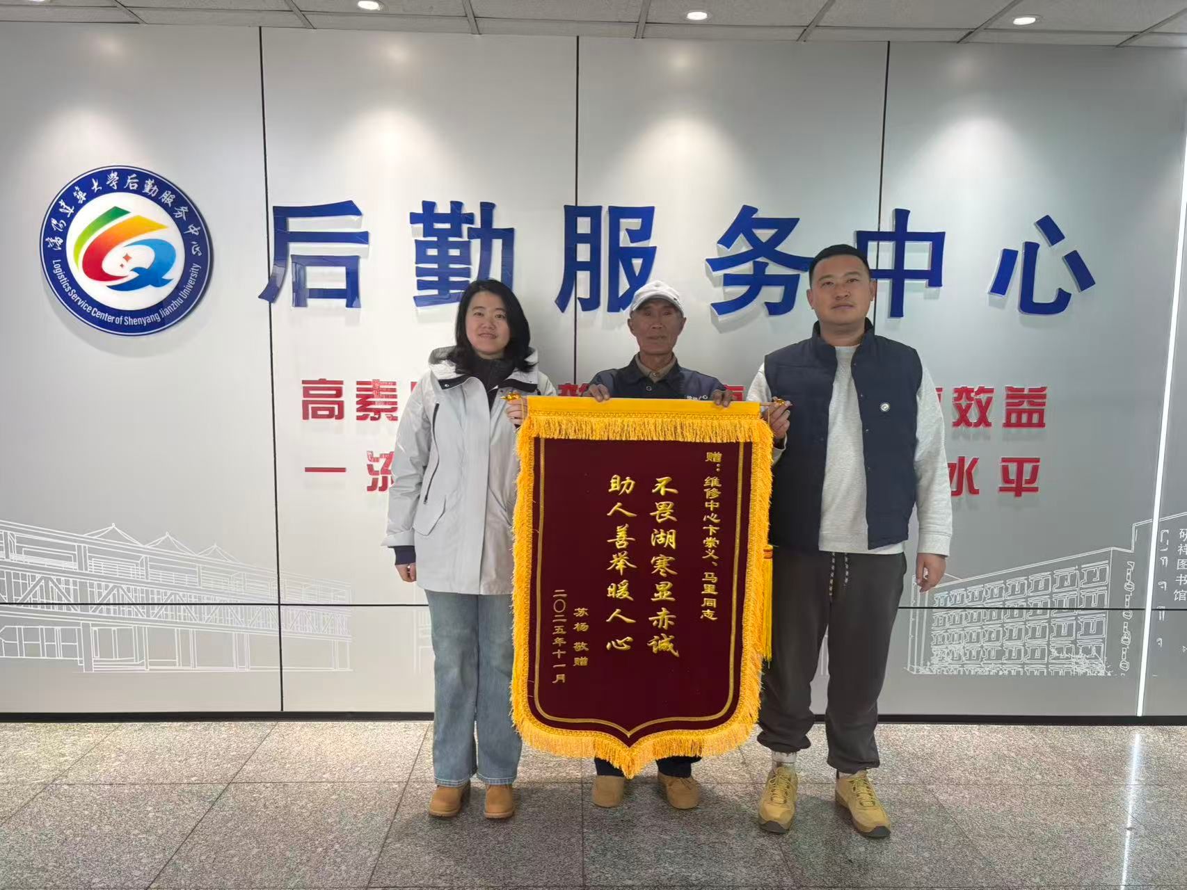 11月17日,一面镌刻着“不畏湖寒显赤诚,助人善举暖人心”的锦旗,送到了后勤服务中心维修中心。这面满载敬意的锦旗,是师生对维修中心职工暖心举动的真挚感谢,更是对后勤服务保障工作的高度认可。